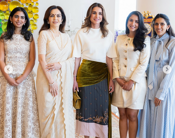 وفي إحدى الصور، ظهرت الملكة رانيا خلال زيارتها لعائلة موكيش أمباني، أغنى رجل في آسيا والمقيم في مدينة مومباي. وقد ارتدت الملكة إطلالة تحترم تراث الهند وأبرزت أناقتها بشكل لافت.