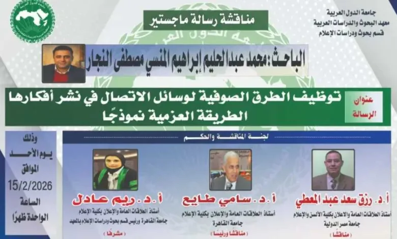 في خطوة بحثية ملفتة، يجري معهد البحوث والدراسات العربية التابع لجامعة الدول العربية استعراضًا لرسالة ماجستير تناولت كيفية استخدام الطرق الصوفية وسائل الاتصال الحديثة في نشر الأفكار الدينية، في دراسة تطبيقية فريدة.