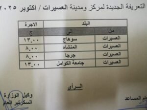 كما أكدت المحافظة على التنسيق مع المحافظات المجاورة لتحديد أسعار النقل من وإلى سوهاج، مع تعليق لوحات إرشادية في جميع المواقف لتوضيح التعريفة الجديدة وتوعية المواطنين.