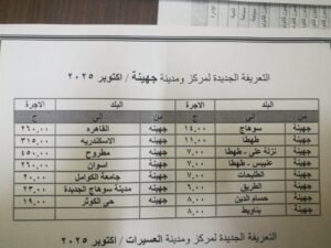 أعلنت محافظة سوهاج، اليوم الجمعة 17 أكتوبر 2025، عن اعتماد التعريفة الجديدة للمواصلات الداخلية والخارجية، بما يشمل سيارات السرفيس ونقل الركاب والتاكسي بالعداد داخل المحافظة وبين المراكز، وذلك بعد قرار لجنة التسعير التلقائي للمنتجات البترولية برفع أسعار الوقود.